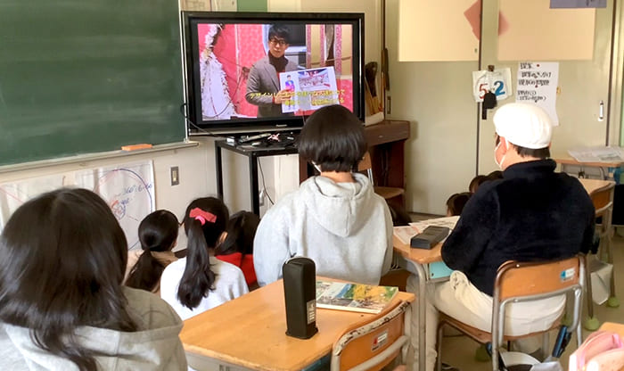 「あなせん・デジタル紙芝居」は3年目。新型コロナへの警戒の仕方が少しずつ変わっていく中、子どもたちの席の間からアクリル板が消え、互いの心の距離が少しだけ近くなりました。大きなテレビモニタとマイクを前に、アニメのアテレコさながらの「声優体験」で、