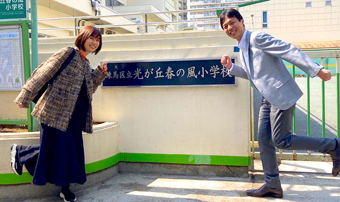 マンションや集合住宅が立ち並ぶ街並みのなかに「光が丘四季の香小学校」はありました。校門をくぐるとわいわい元気に校舎から1年生が出てくるところでした。「こんにちはーー!」「お客さんの入り口はあっち!」そんな賑やかな歓迎を受け、早々にとても温かな気持ちに。