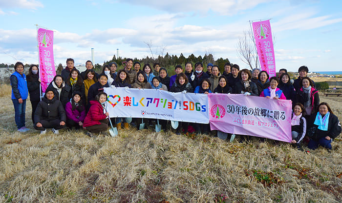 2023年2月4日、フジ・メディア・ホールディングス各社の有志が集い、福島県相馬市で桜の植樹活動を行いました。地震や津波、さらに放射能の影響を受けた福島県で「30年後に子どもたちが誇れる桜並木を作りたい」との思いからスタートした「ふくしま浜街道・桜プロジェクト」。