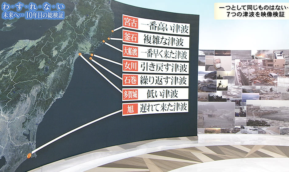 またフジテレビは、未曾有の災害を決して忘れず教訓とするため、東日本大震災以降、22回にわたって、シリーズ『わ・す・れ・な・い』を放送してきました。今回は6局共同防災プロジェクトの一環として、『Mr.サンデースペシャル わ・す・れ・な・い 宮古市を襲った5つの津波』(2021年3月7日 21:00~23:09放送)と、『わ・す・れ・な・い 未来へ 10年目の総検証』(2021年3月11日 15:15~16:50)を放送しました。各局から寄せられた津波の映像も織り込みながら、津波の被害について多角的に検証しました。