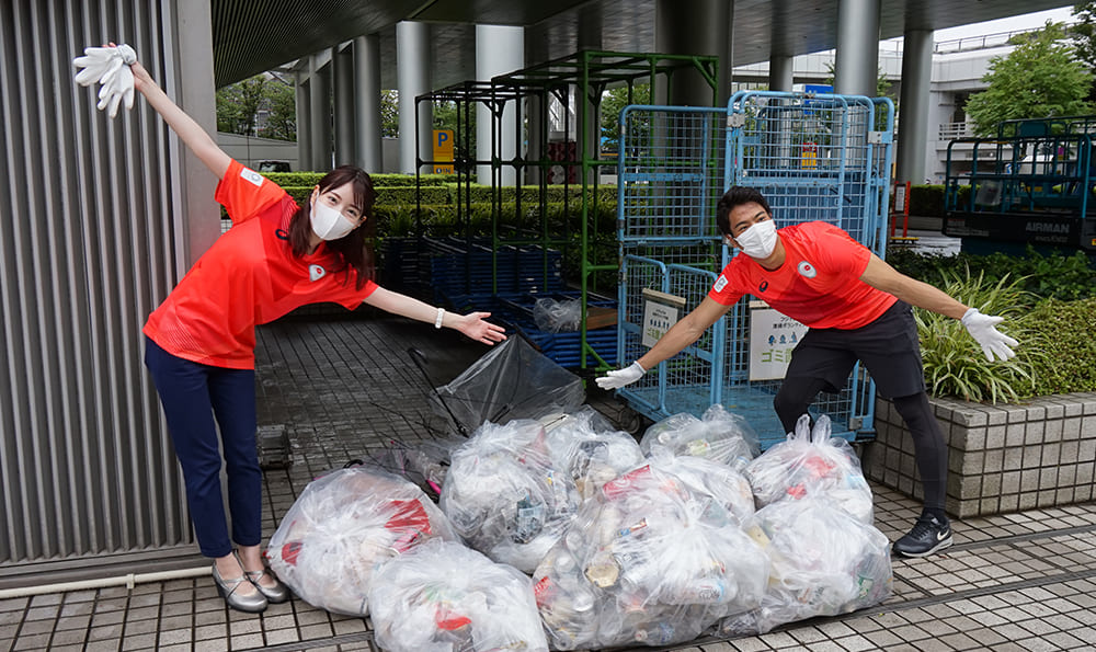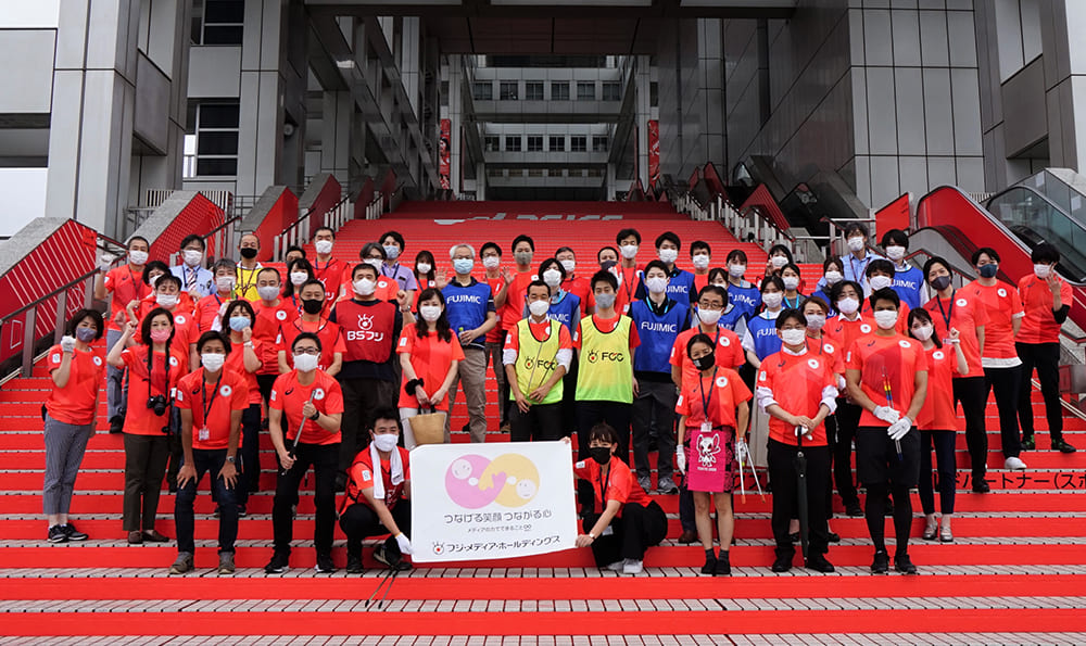 清掃活動には、フジテレビをはじめフジ・メディア・ホールディングスの各社から約60人の有志が参加し、感染対策を講じた上で赤い五輪公式応援Tシャツを着て、トライアスロンが行われる沿道や周辺の植え込みの中などの清掃を行いました。