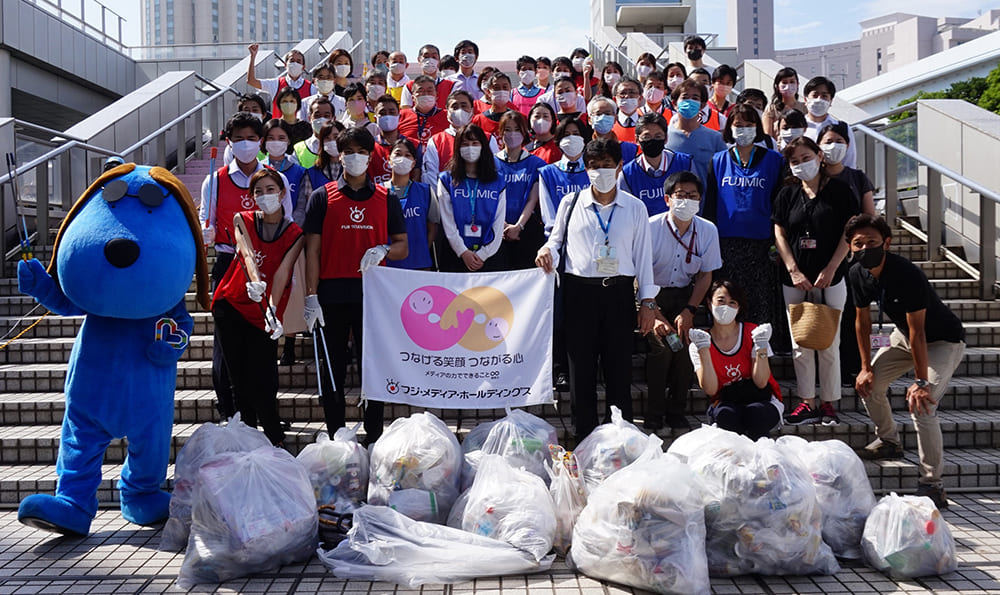 緊急事態宣言が解除された10月8日、フジ・メディア・ホールディングス合同清掃活動を行いました。今回の活動には、フジ・メディア・ホールディングス傘下の17社から計60人が集結し、さらにフジテレビキャラクターのラフくんが清掃活動に初参加。「密にならない」「軍手着用」「トングの使用」など、しっかりと感染対策を講じた上でお台場エリアを綺麗にしました。