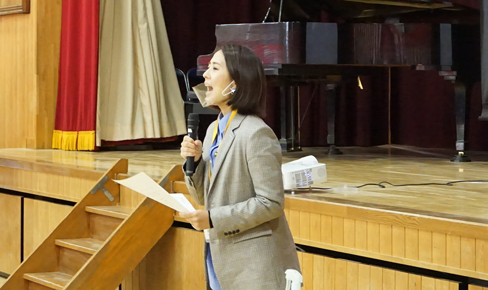 まずは梅津アナウンサーと自己紹介をしながら、アナウンサーのお仕事についてお話します。ニュースの原稿読み、司会進行、ナレーション、提供読みなど実は色々なお仕事があるアナウンサーのお仕事。その中の一つ、インタビューが今回の出前授業の題材です。