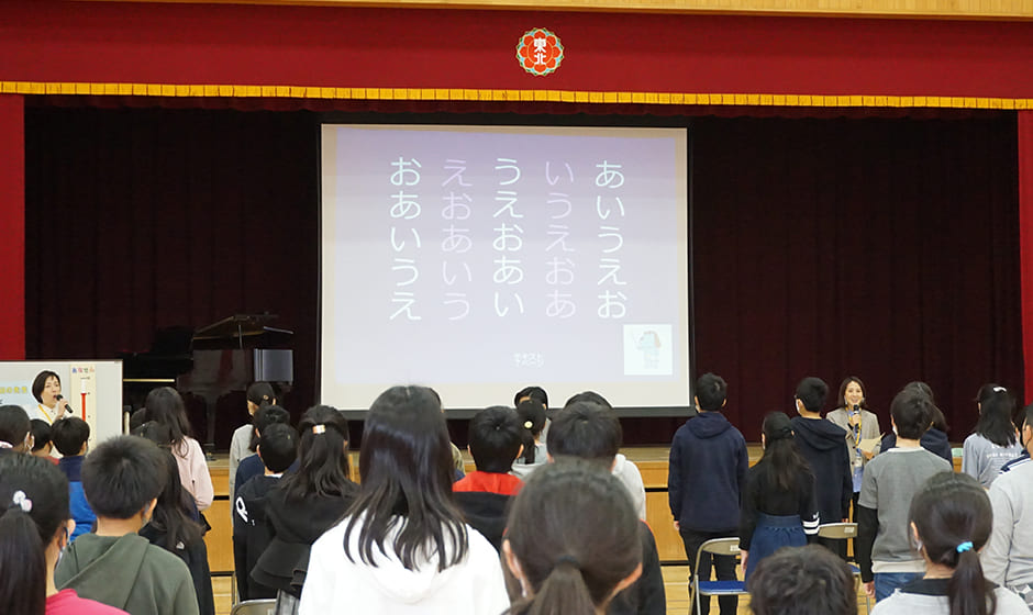 インタビューとはどういうもので、どんなことがポイントになるのかを梅津アナウンサーと説明。良いインタビュアーになるためには、まずは聞きやすい声で質問することが大切ということで、発声練習もしました。早口の発声練習にも果敢に挑戦し、みんなの前で発表してくれる子もいました。