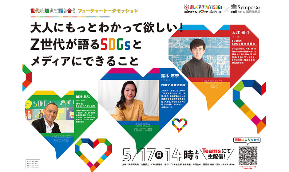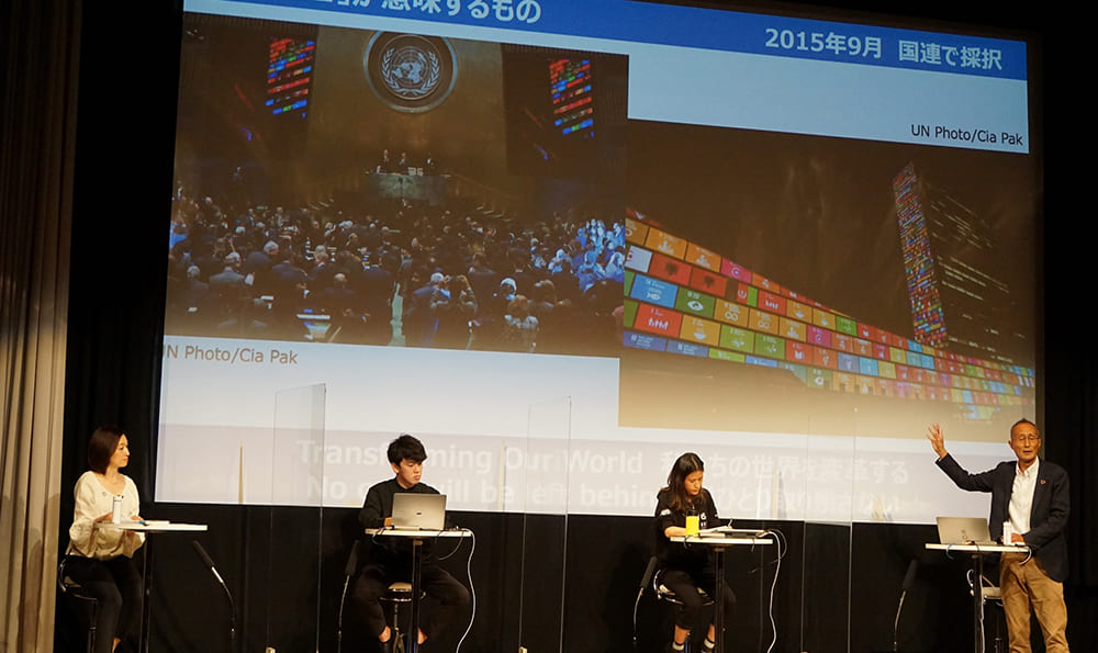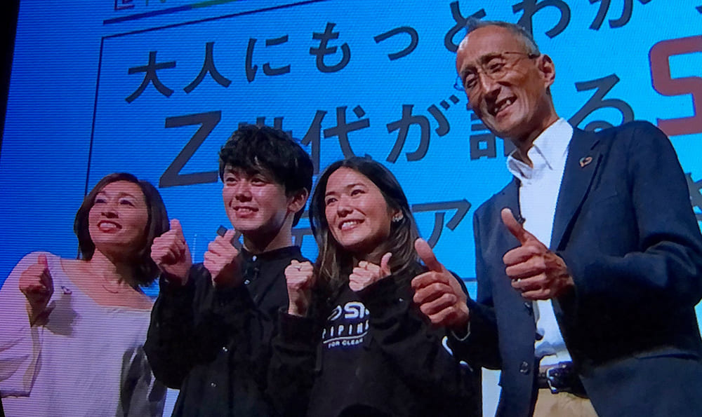 これは、「楽しくアクション!SDGs」プロジェクトの一環として企画されたもので、登壇したのは大学2年生の入江遥斗さん(19歳)と環境活動家・露木志奈さん(20歳)、そして「ジャパンSDGsアクション推進協議会」を立ち上げたSDGsのスペシャリスト・博報堂DYホールディングスCSRグループ推進担当部長の川廷昌弘さんの3人です。
