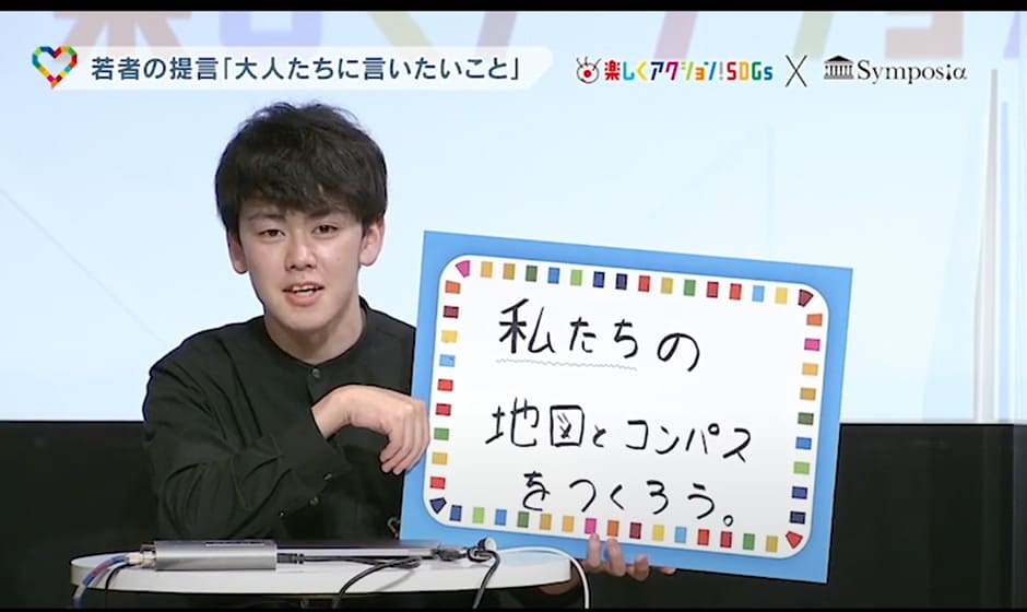 週6で全国で講演する20歳の環境活動家「私たちの地図とコンパスをつくろう」。このメッセージが意味するところは、開発された社会が必ずしも悪いわけではない、もっと全体を俯瞰して見て、「SDGsは、2030年にどんな社会であってほしいか、どんな自分でありたいかと同義語」だから、年齢・性別・所属など関係なく、みんなが《一緒に動く仲間》として変えていけばいい。そのための地図とコンパスを持つべきだと。