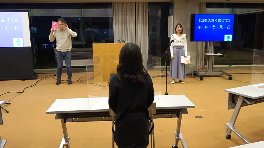 お互いの緊張をほぐすため、コミュニケーションの基本である姿勢・発声を意識しながら大きな声を出して、声を出すことに慣れてもらいました。