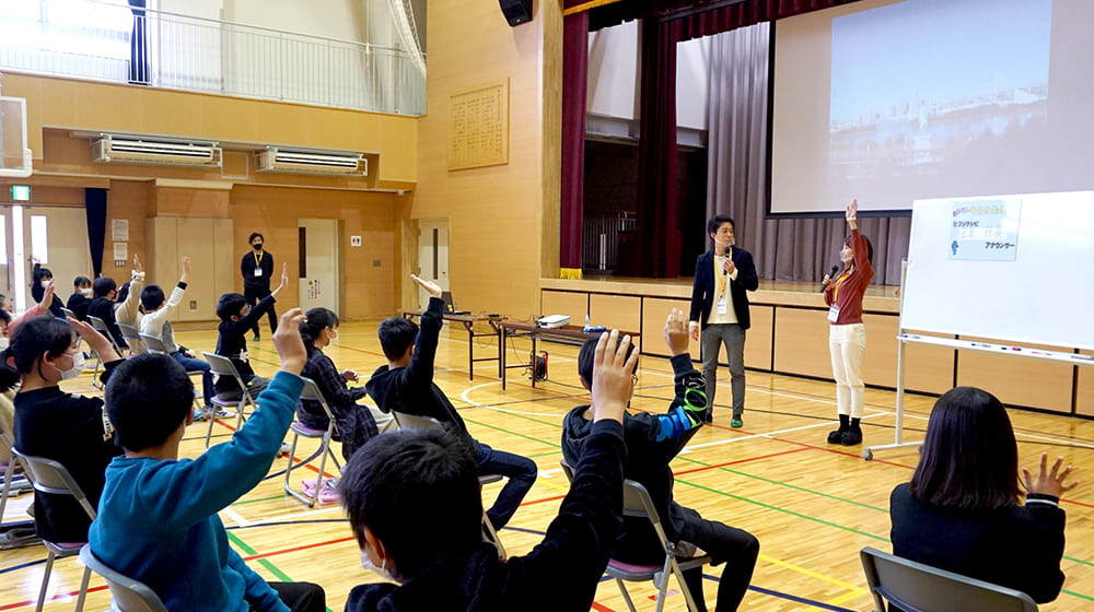 私たちに質問をして、内容を原稿にまとめスピーチをするという体験をしてもらいました。どんな質問をしたらいいかを一生懸命考え、勇気を出して手をあげて質問してくれる子どもたちに元気をもらいました。