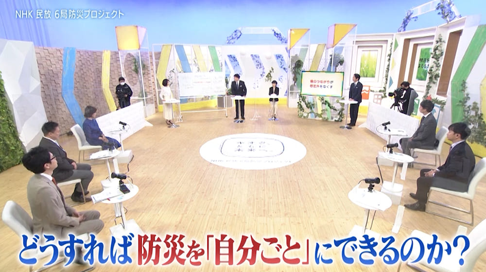 前回のNHKでの番組共演をきっかけに、 NHK在京キー局6局のアナウンサーによる災害報道についての勉強会が継続的に開かれていました。NHKで4月3日に放送した「明日をまもるナビ スペシャル『未来の命を救いたい』」にはその勉強会参加アナウンサーが出演して、どうすれば防災を〝自分ごと〟にできるのかをテーマに議論を展開しました。NHKの塚原愛アナとともにMCを務めるのは前回に引き続き伊藤利尋アナ。
