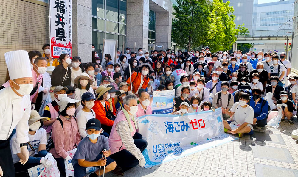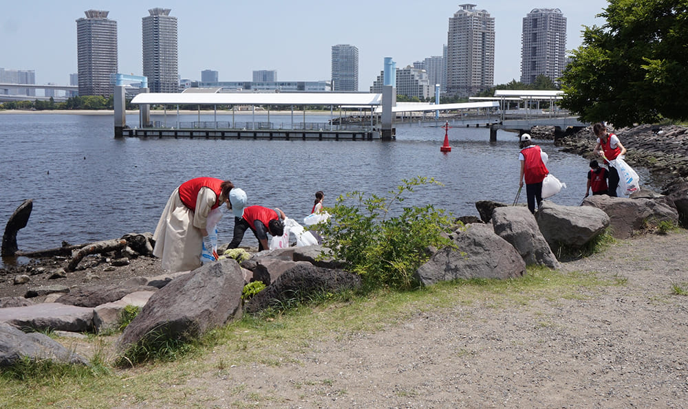 フジテレビのあるお台場では、「海と日本PROJECT」に取り組む日本財団よりゴミ袋の提供を頂き、その特別推進パートナーのサザエさんも参加。海浜公園の岩場などに溜まっていた缶やペットボトルなど70リットルのゴミ袋9個分のゴミを回収しました。