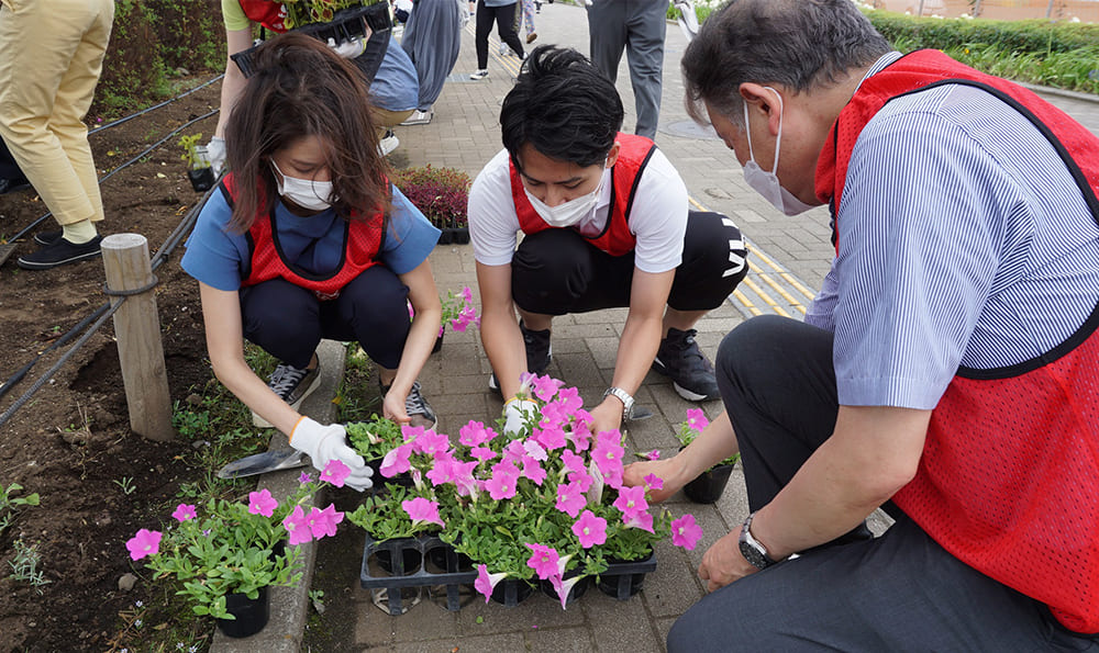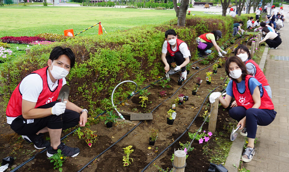 6月24日、フジテレビ本社近くの、シンボルプロムナード公園「夢の広場」周辺で行われた、夏の苗植え活動に参加しました。これは東京臨海副都心まちづくり協議会の環境活動の一環で、夏の暑さに強い花の苗を植え、夏に臨海副都心エリアを訪れるお客様に楽しんでもらおうというものです。