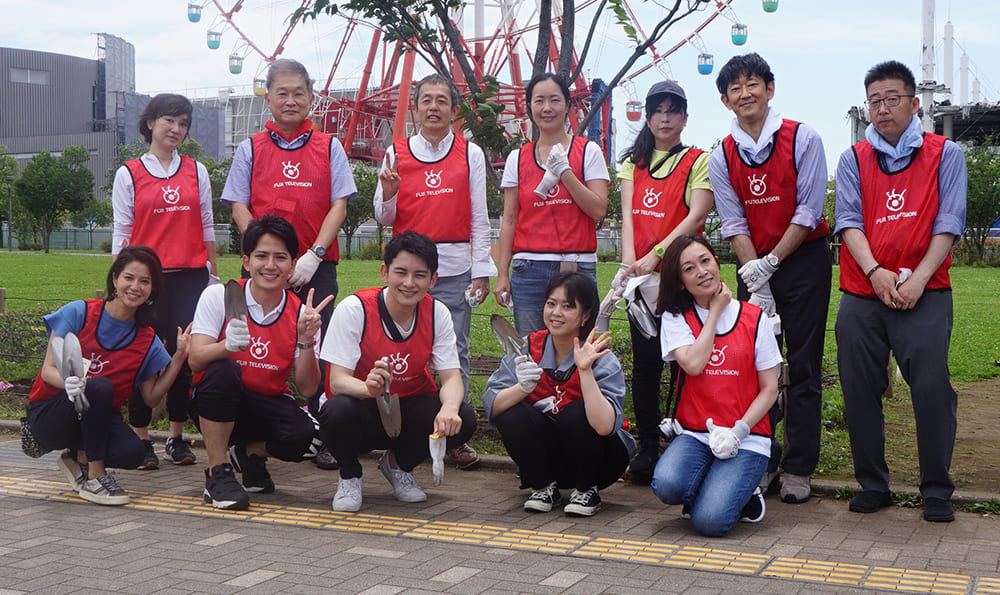 フジテレビからは、遠藤玲子アナ、安宅晃樹アナ、大川立樹アナ、杉原千尋アナら12人が参加して、ひまわりや、ペチュニア、ポーチュラカ、コリウスなどの苗を植えました。