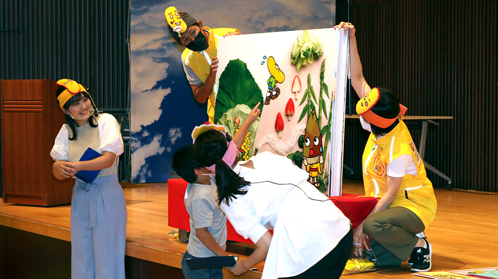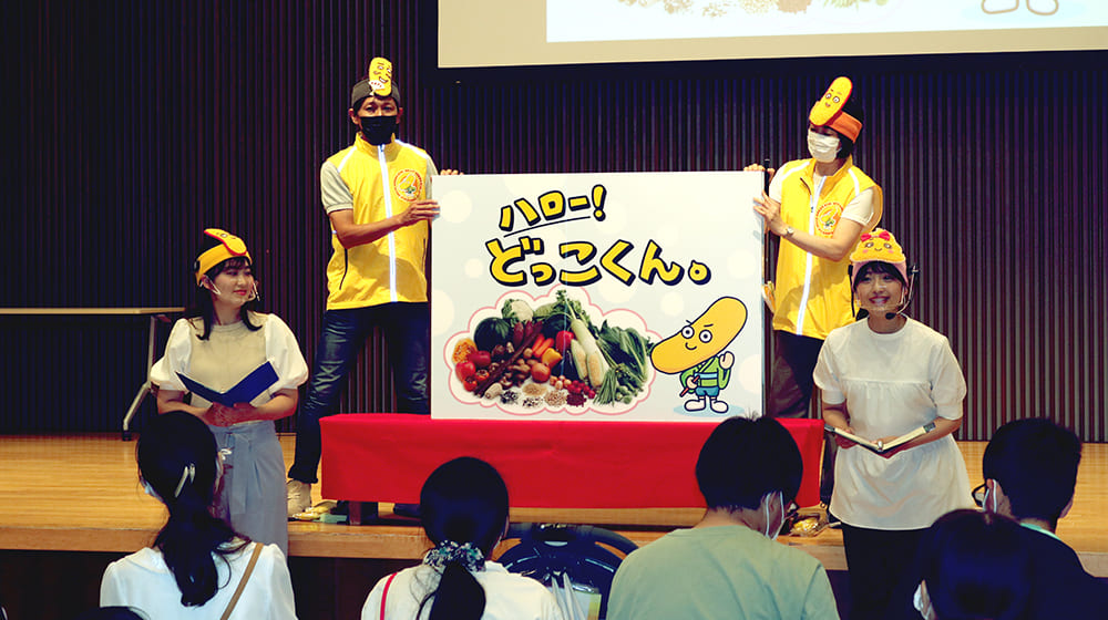7月3日、3年ぶりに実施した鹿児島テレビの「KTSすこやかふれあいフェスティバル」のステージイベントとして食育出前授業『ハロー!どっこくん』を開催しました。