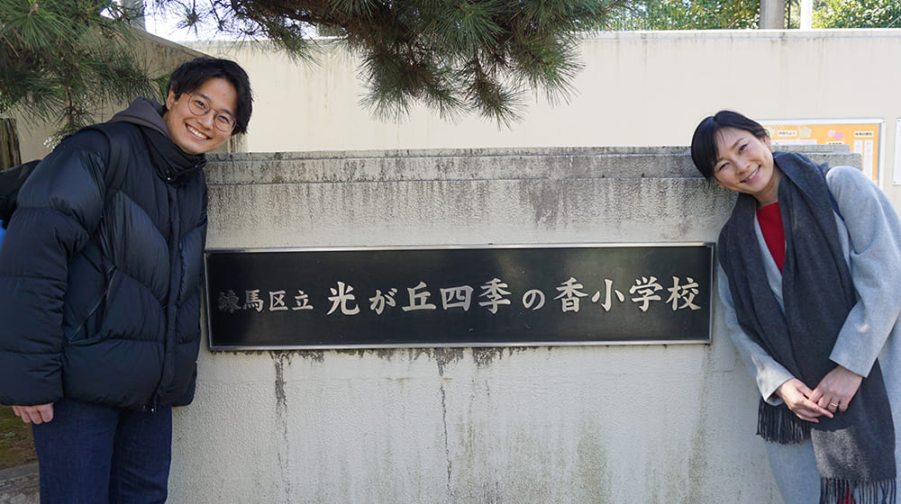 マンションや集合住宅が立ち並ぶ街並みのなかに「光が丘四季の香小学校」はありました。校門をくぐるとわいわい元気に校舎から1年生が出てくるところでした。