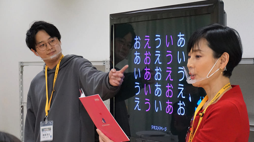 さあ、授業がスタート。私たちの自己紹介のあと、黒瀬アナのスポーツ実況披露でみんな「おお~~!」と大盛り上がり。とたんに笑顔が弾けましたね。私も嬉しくなってしまいます。そしてみんなで起立!「あ、え、い、う、え、お、あ、お!」大きな声を出すって結構難しいよね。でもなんだかスッキリしませんか。会場の空気も温まります。そして今日のテーマは『インタビュー』。