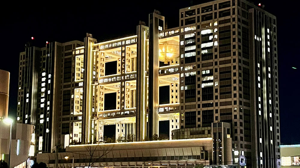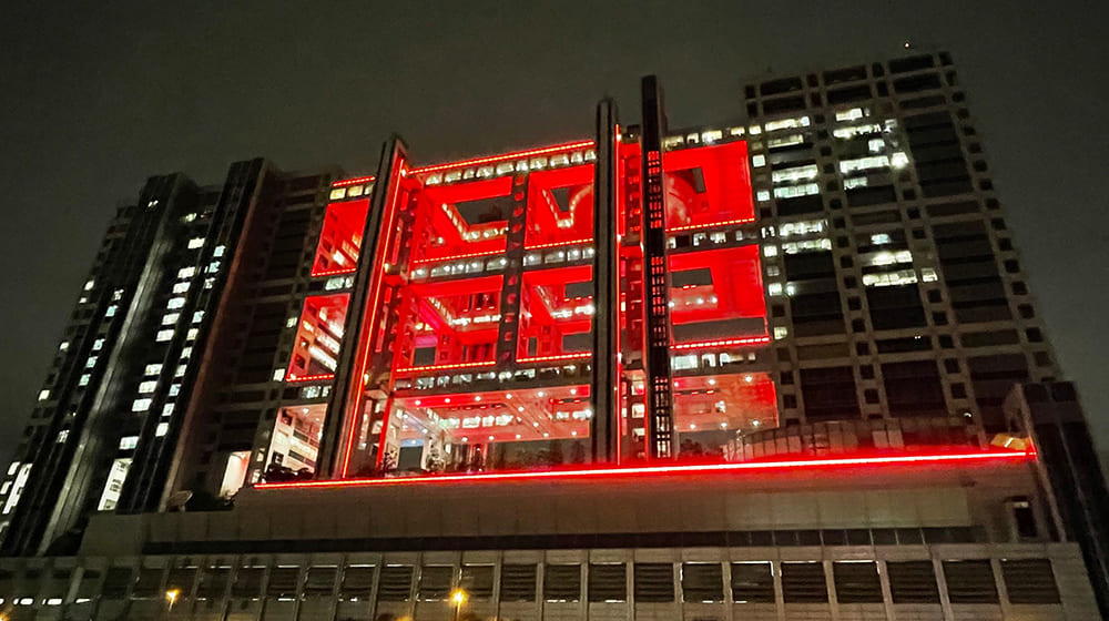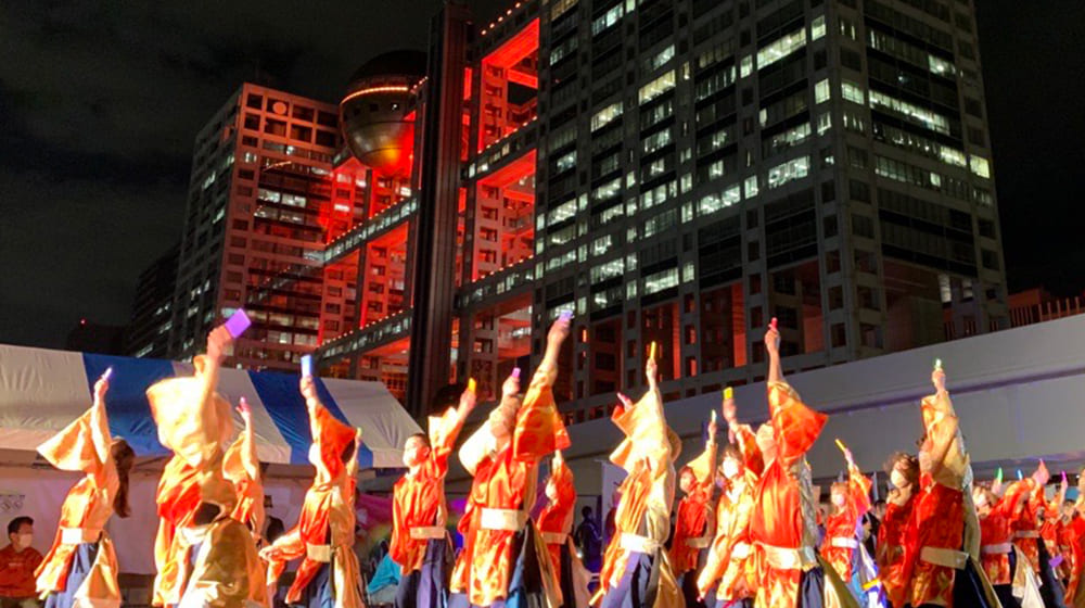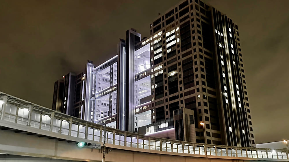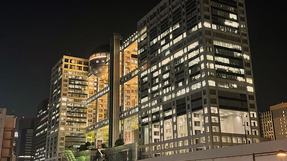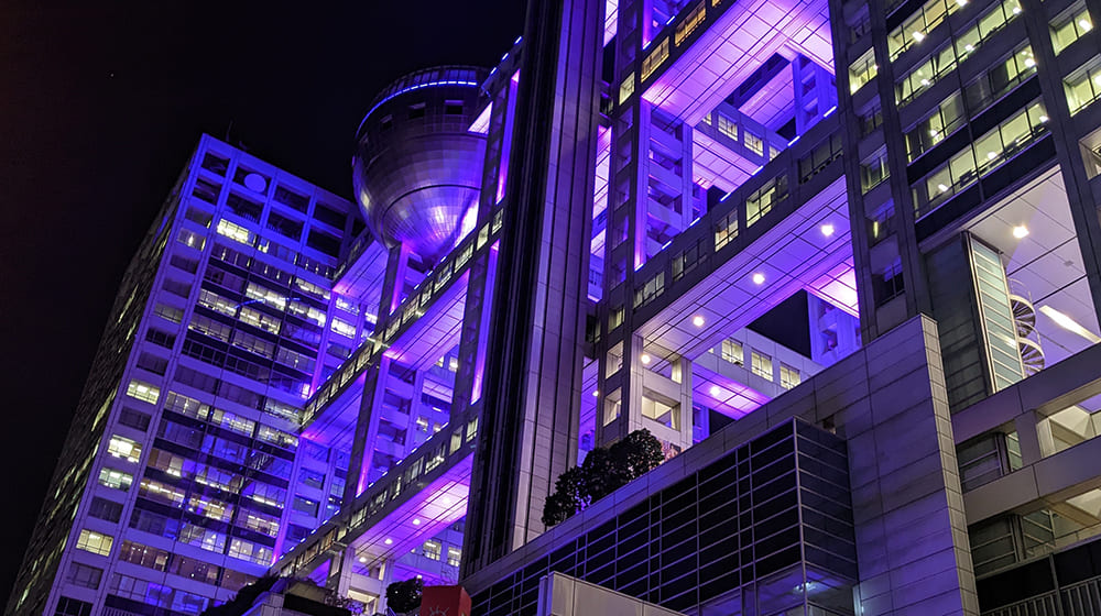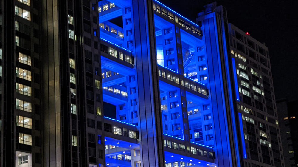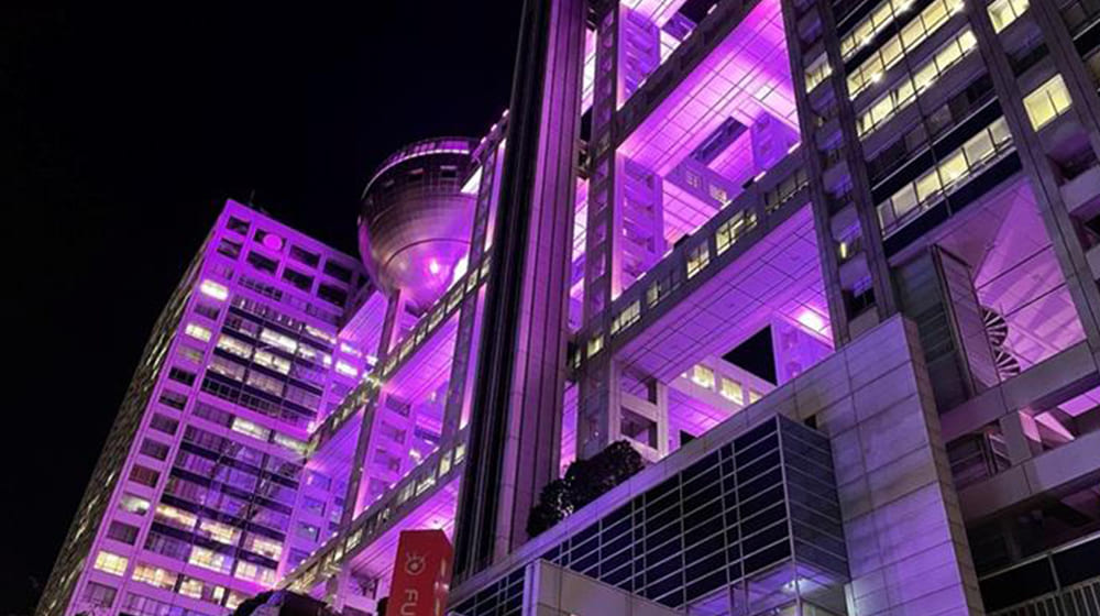 2020年4月に生まれ変わったフジテレビの社屋イルミネーション「AURORA∞(オーロラ)」。カラフルなライトアップで臨海副都心エリアのにぎわいを創出するとともに、2015年4月から始めた社会課題への支援の意思を色で表すアウェアネスカラーライトアップを、2022年度も実施しました。
