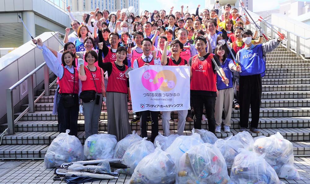 フジ・メディア・ホールディングス傘下や関係協力会社の15社、計80人が、フジテレビ本社屋の周辺を中心に清掃し、70リットルのゴミ袋14個分と傘10本などを回収しました。