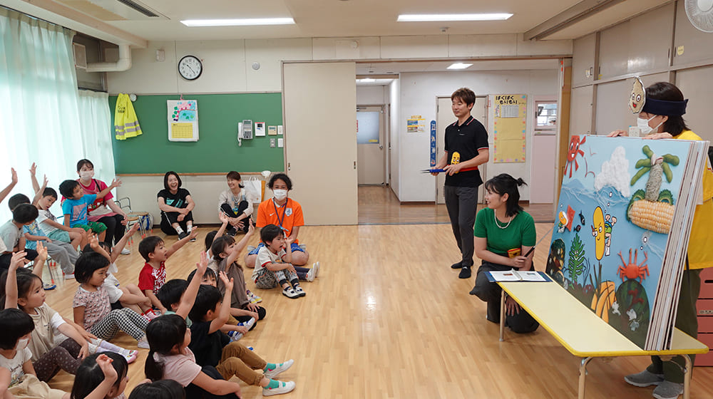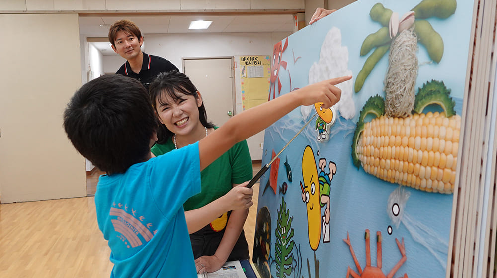 食育の出前授業では、巨大な紙芝居を使い『ハロー!どっこくん。』の冒険を通じて旬の野菜を楽しく覚えます!なんとこの日の給食には、その紙芝居に登場する夏の食材、オクラと糸寒天が入った和え物も登場。知識だけでなく、実際に味わって食や排泄の大切さを学びました。