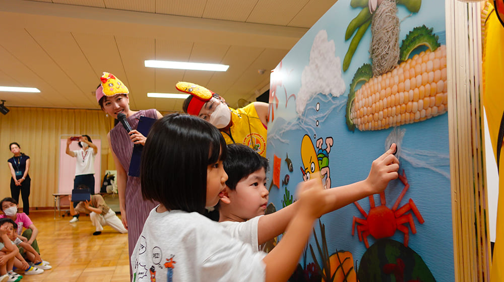 絵の中から春・夏・秋・冬の旬の野菜を探してもらうコーナーでは、みんな一斉に勢いよく手を挙げてくれたので、なるべくみんなに参加してもらおうと、何人かで協力して野菜を見つけてもらいました。