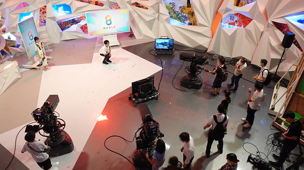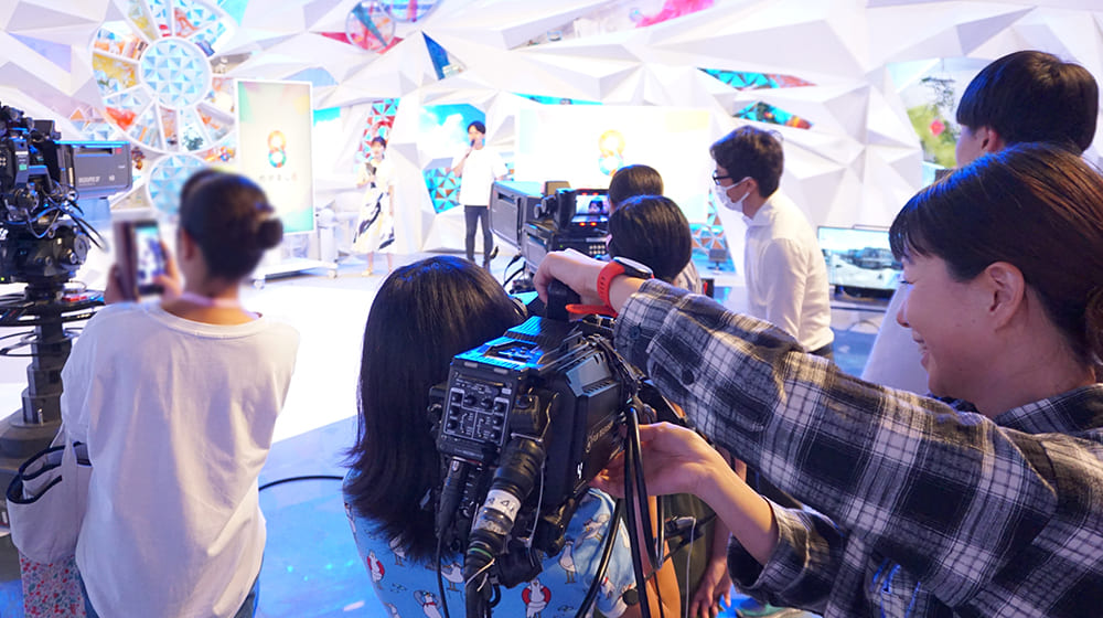 竹内友佳アナウンサーと安宅晃樹アナウンサーのコメントに合わせて、カメラを担いだ子どもが実際に撮影すると、「本物のカメラマンみたい!」と、家族から声援と拍手が送られました。スタジオ全体が盛り上がってきたところで、アナウンサー2人に歌を歌ってもらい、プロのカメラマンによる歌番組の収録を披露。歌に合わせてスタジオを縦横無尽に動き回るプロの技に歓声が沸き起こりました。