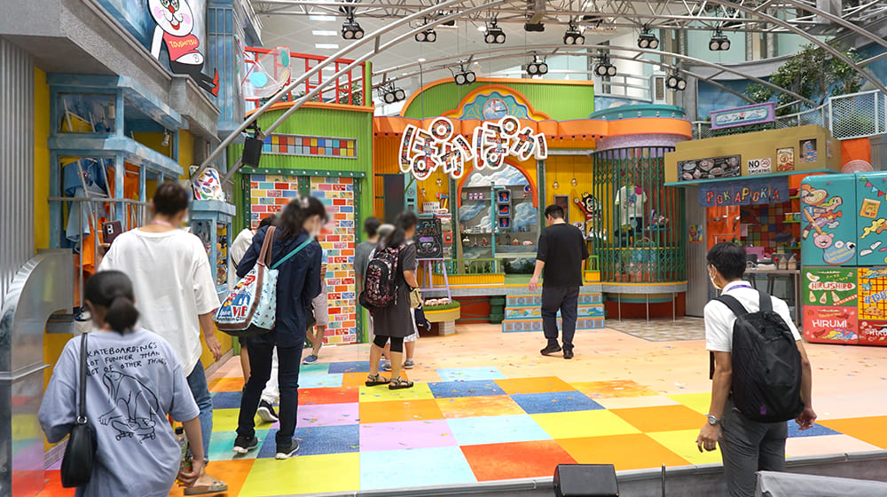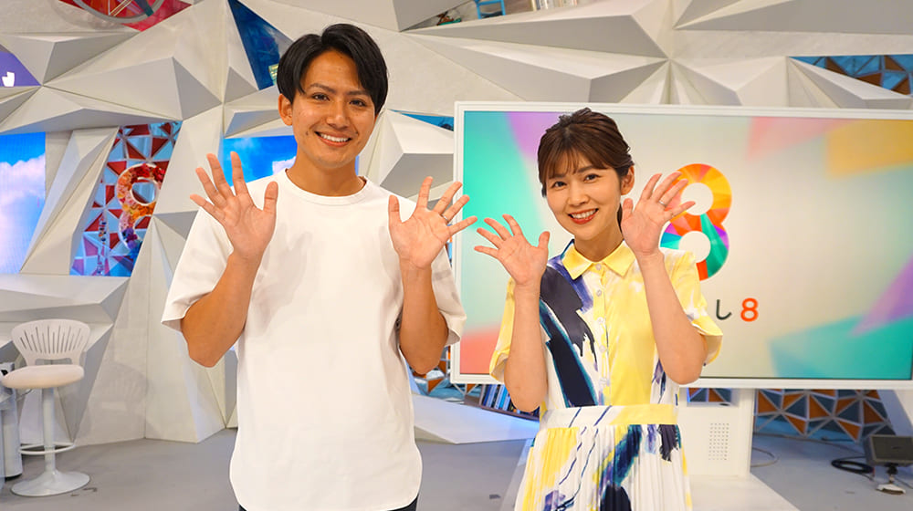 そして生放送が終わったばかりの「ぽかぽか」のフロアへ。スタッフが片付けを行う中、お邪魔させていただき、ド派手なセットの中で写真撮影!キラキラしたセットに触れるだけでなく、テレビでは映らない裏側も覗いちゃいました。