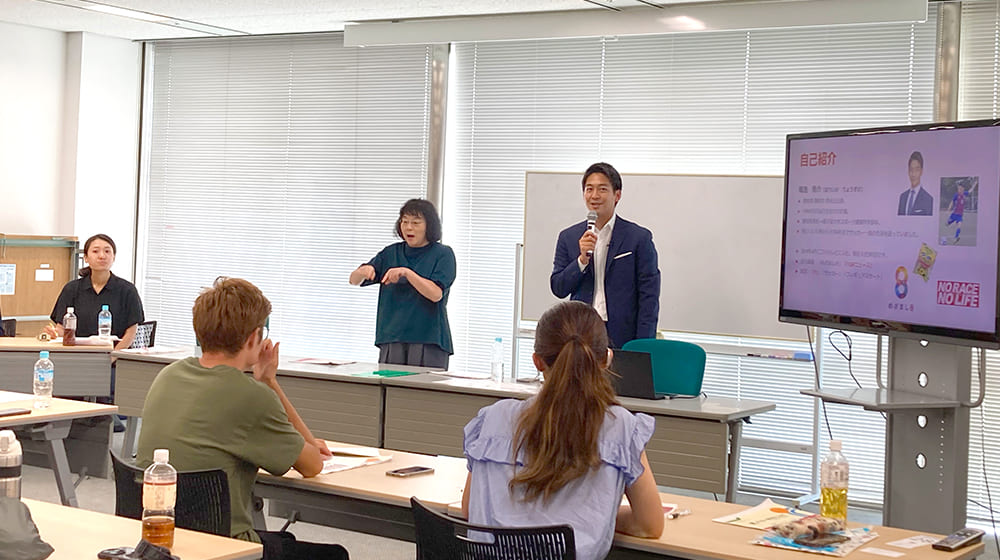 「手話による実況とはどんなものなのか。」「音声実況と同じように行うことは可能なのか。」など様々な疑問が当初はありました。しかし、講義の中でモータースポーツ実況のポイントなどを説明し、実際にアカデミーを受講しているろう者のみなさんに映像を見ながら手話実況にチャレンジしてもらうと、手話や表情で力強く表現し、レース展開を描写し始めました。
