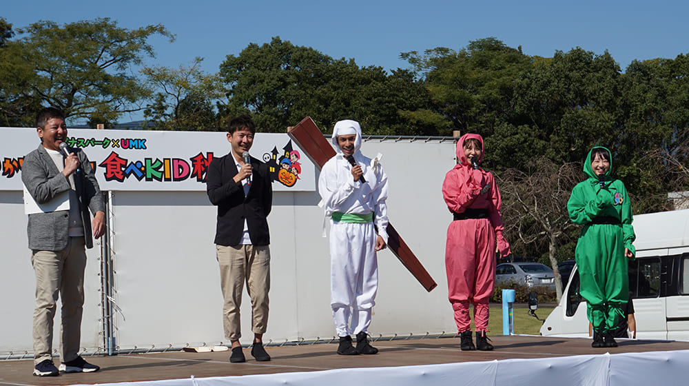 迎えたイベント当日。会場となる宮崎県ルピナスパークへ。今回、テレビ宮崎のアナウンサーは食品ロスのイメージキャラクター「食べKID」の衣装、忍者のコスチュームで参戦してくれました。1回目はオカファーエニス豪アナウンサーとともに。2回目は渕上明里アナウンサー・宮崎愛子アナウンサーと。
