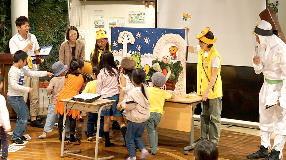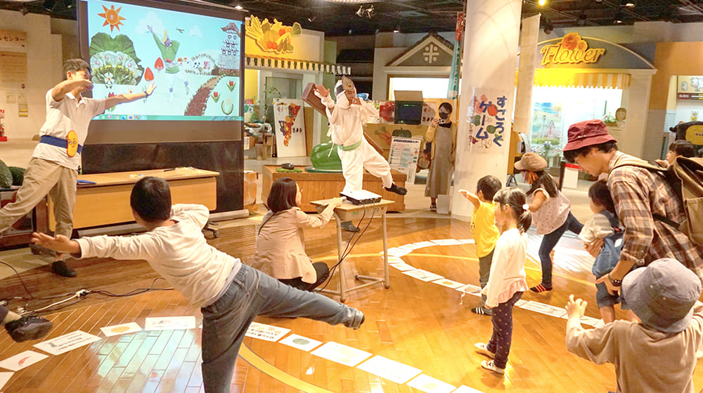 始めは、「子どもたちは恥ずかしがってあまり反応してくれないのだろうか…」と不安に思っていました。しかし、始まると徐々に子どもたちの顔に笑顔が見え、おまじないの野菜探しに夢中になり、みんなの楽しそうな雰囲気に乗って、最後には体操まで思いきり踊っていました。
