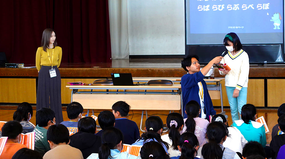 授業の最初は、まず、発声の基本となる姿勢や口の開け方、滑舌練習。