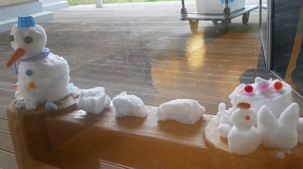 さらに今回、北海道の雪を実際に子どもたちのもとに届けて、一緒になって雪の楽しさを感じてもらいました。届いた雪を見た瞬間、子どもたちのテンションも一気に上がり、みんな雪に夢中になり、中には、初めて雪を触った子もいて「冷たい!」「サラサラで気持ちいい」と喜んでいました。子どもたちが作った雪玉や雪だるまを画面のところに見せに来てくれたので、僕も自分で作った雪だるまを見せ合いっこしました。