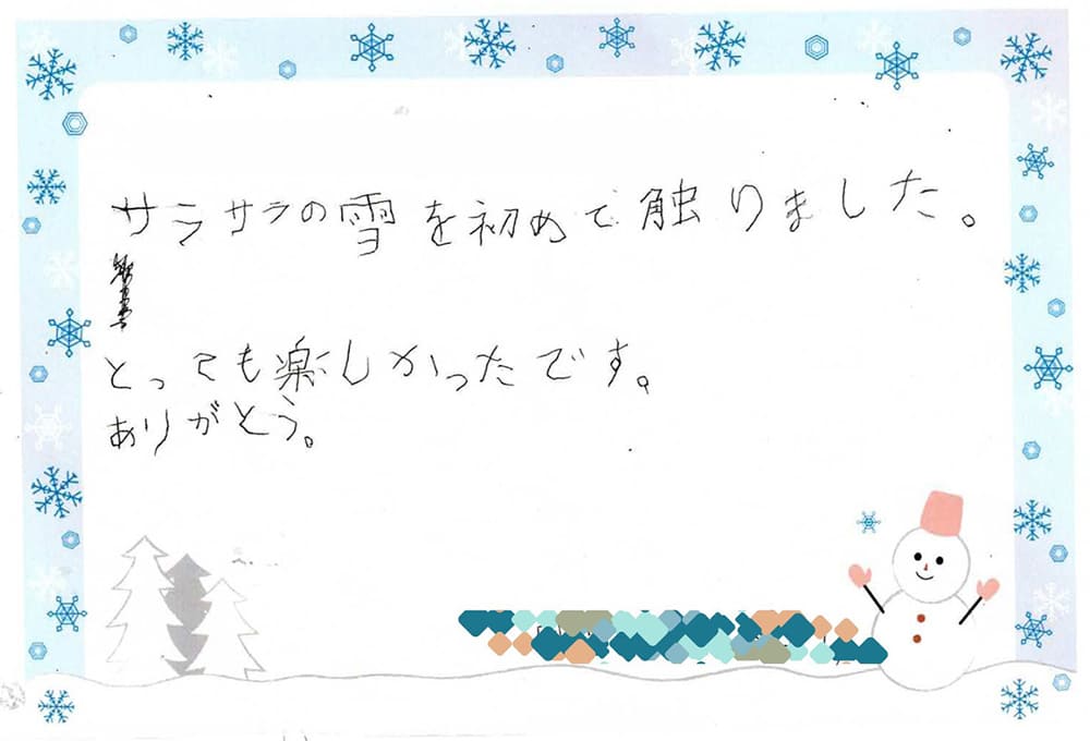 僕は長野出身で雪には馴染みがありましたが、子どもの頃に戻った気持ちになり、オンラインで繋がっていた子どもたちと一緒になって雪を目一杯楽しみました。今回、2日間でたくさんの子どもたちと交流できて本当に楽しい時間を過ごすことができました。何より初めて雪を触った子どもたちには雪の楽しさを感じてもらえてとても嬉しかったです。