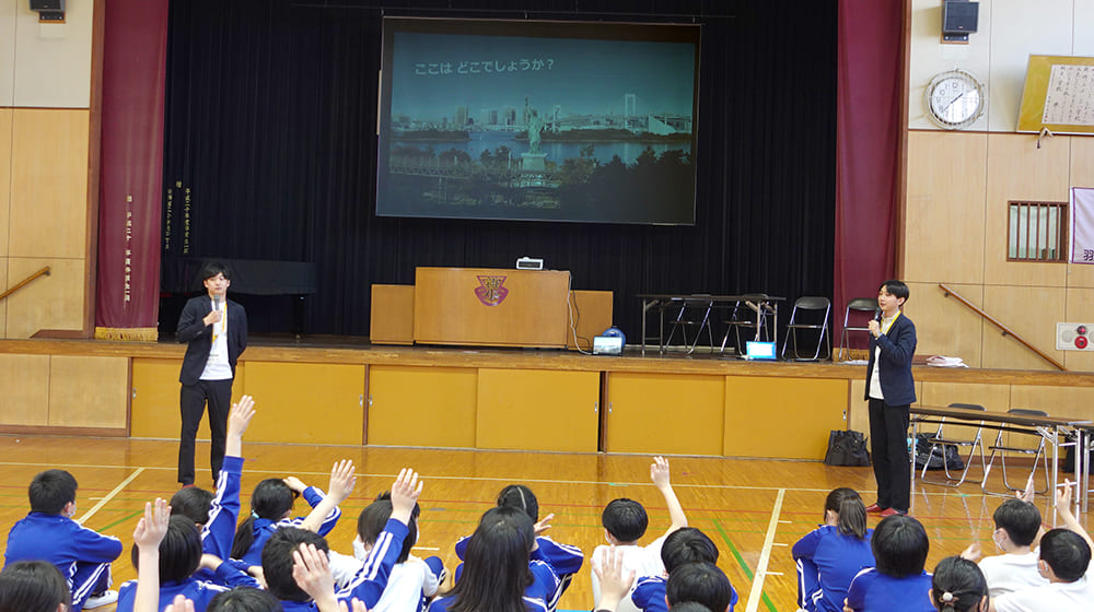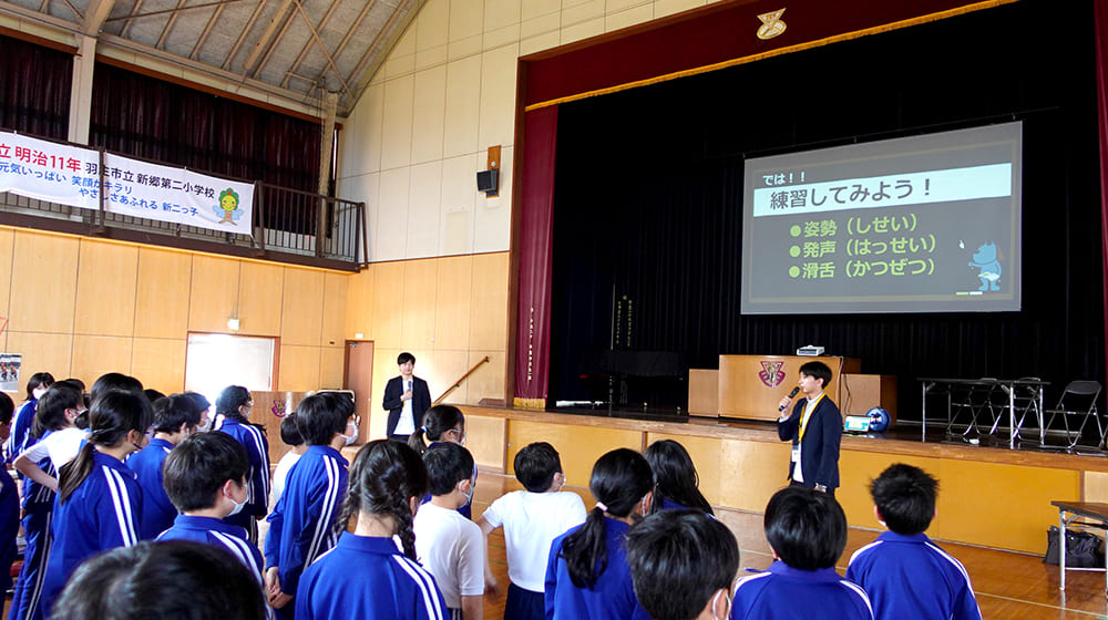 事前に学校の先生からは「おとなしい子が多いかもしれません」とお話を頂いていたのですが、いざ授業が始まると、そんな心配も全く感じないほど、皆さんとても積極的に声を出してくれました。特に発声・滑舌練習では大きな声が体育館に響き渡り、こちらも序盤で汗ばむほどでした。正しい発声方法、スピーチの基本を学んで前半終了。