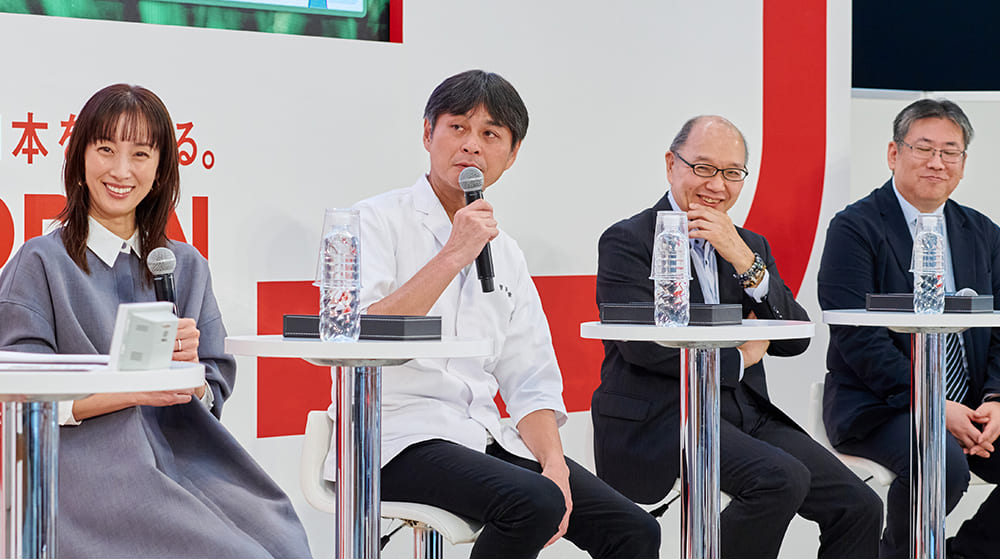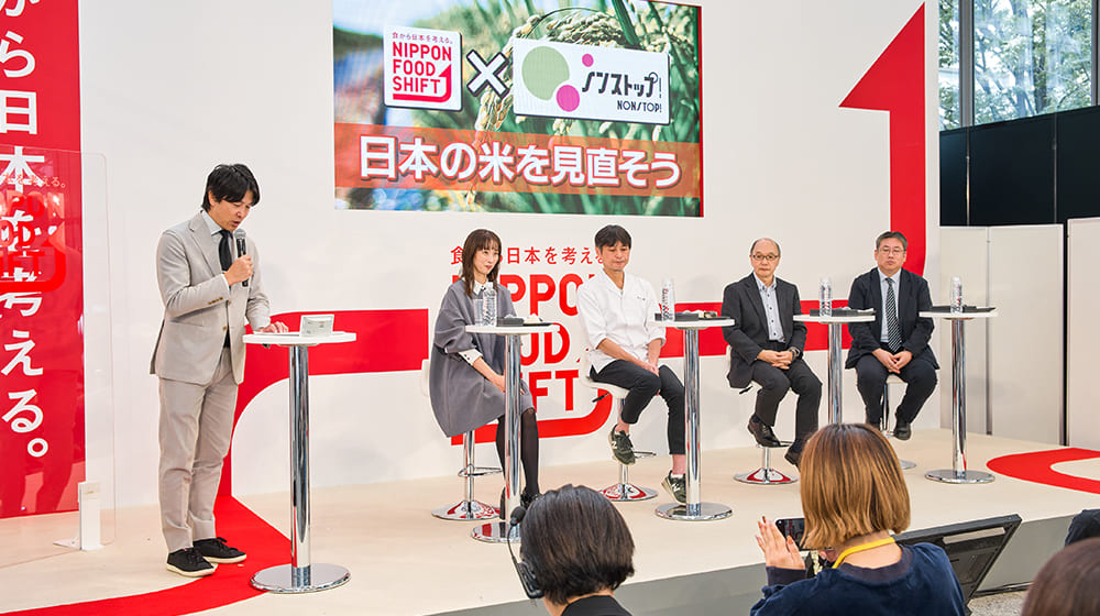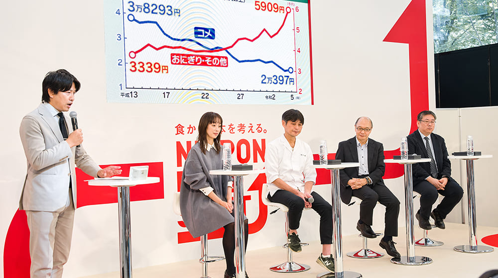 トークイベントに参加したのは、タレントで2児の母 坂下千里子さん、日本料理店「賛否両論」の店主 笠原将弘さん、五ツ星お米マイスターの西島豊造さん、そして、農水省の河村仁大臣官房政策課 政策課長です。