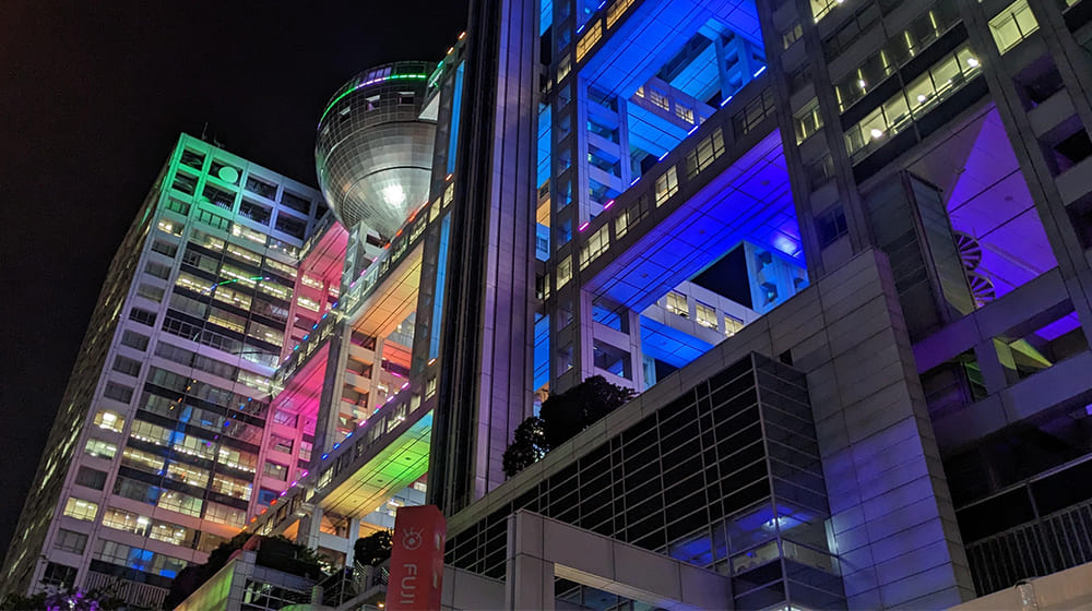東京レインボープライド開催期間中、フジテレビ本社ビルや大階段などが、多様性を認め合える社会の実現を願ってレインボーカラーにライトアップされました。