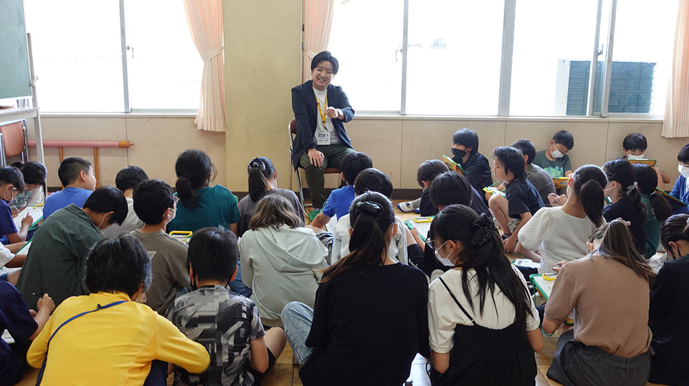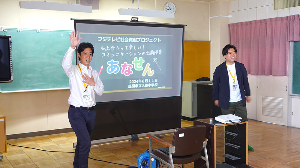 「アナウンサーはどんな仕事をするかわかるかなー?」と聞くと…「ニュース!」「取材!」「災害時の放送!」「ドッキリGP!」など、みんな挙手して答えてくれました。座間っ子は元気ハツラツです。