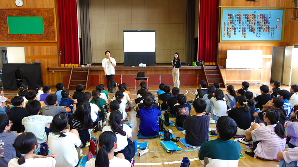 今回の『あなせん』に参加してくれたのは、小学校6年生の82人です。2人のアナウンサーの自己紹介のあと、発声のための姿勢や発音の仕方をみんなで挑戦!