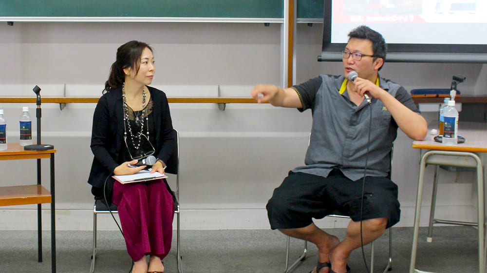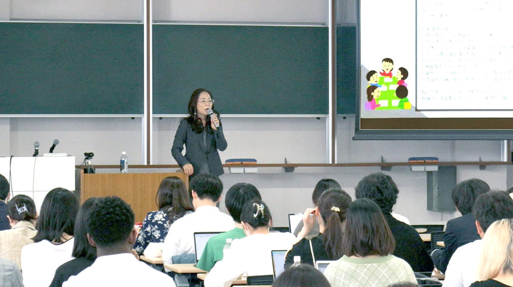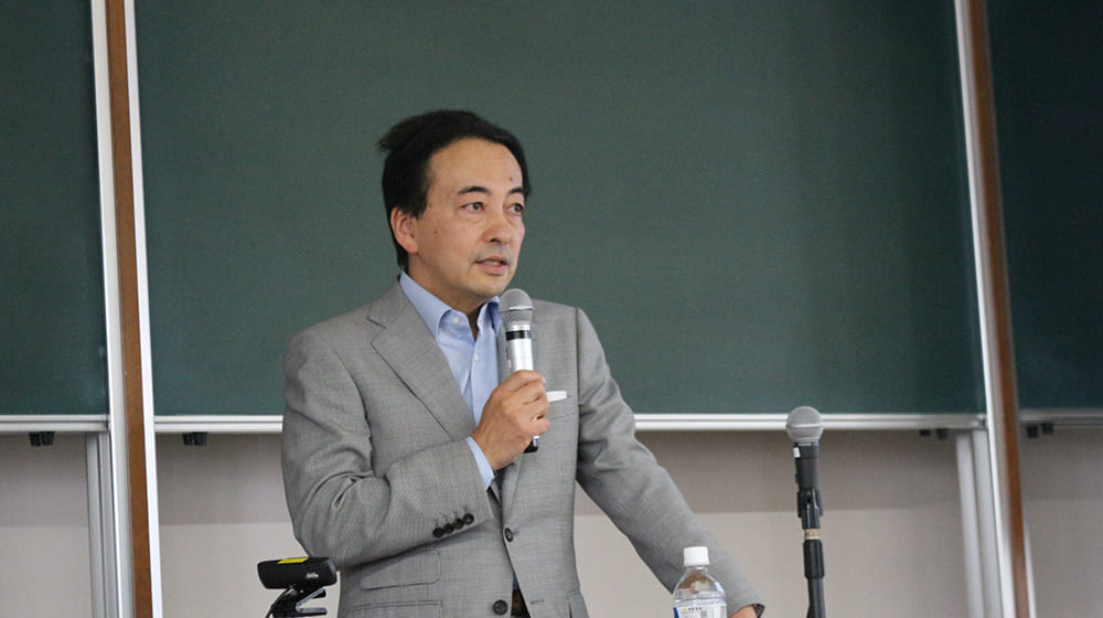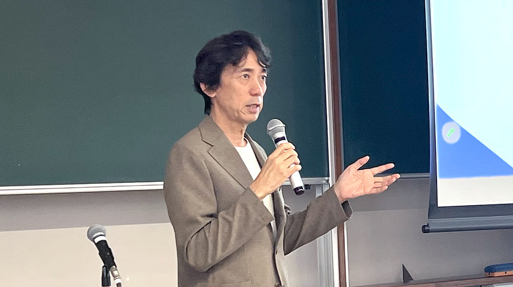 講座の集大成として、学期の最終日にはこれまで学んだことを念頭に、学生から新たなビジネスプランをグループごとに発表してもらいました。審査員として関西テレビ放送の大多亮社長が登壇し、それぞれのビジネス案に対する感想を話しましたが、中には具体的で実現できそうな企画もあり、「レベルが高い!」と大多社長もびっくりする場面もありました。