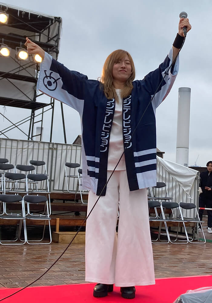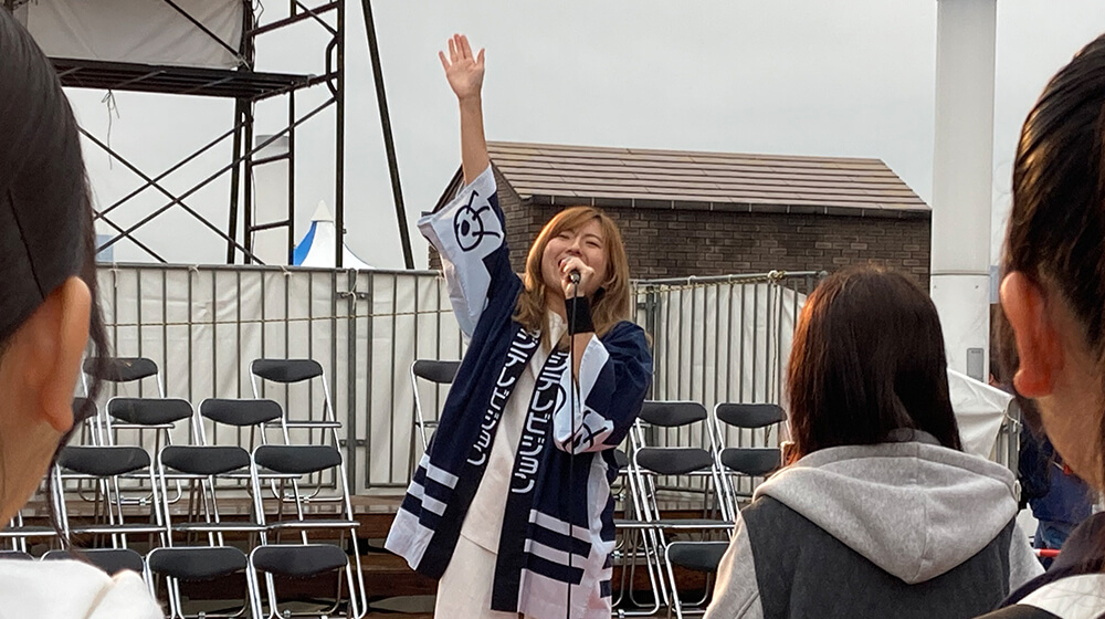 『ドリーム夜さ来い祭り』の会場では、シンガーの宇海-UUMI-さんのステージが設けられ、宇海-UUMI-さんはFNSチャリティキャンペーンのキャンペーンソング『Pass the Smile』などを披露したほか、チャリティへの協力を呼び掛けました。