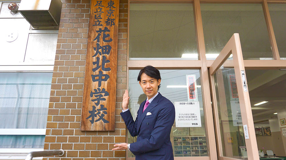 足立区立花畑北中学校の体育館に集まった生徒の皆さんの前で、いよいよコラボ授業スタート。