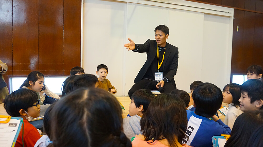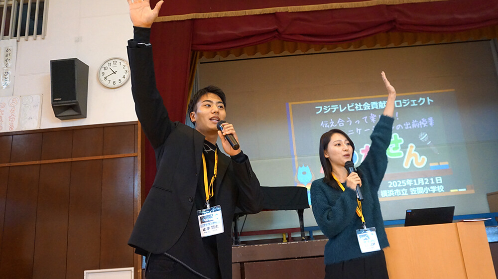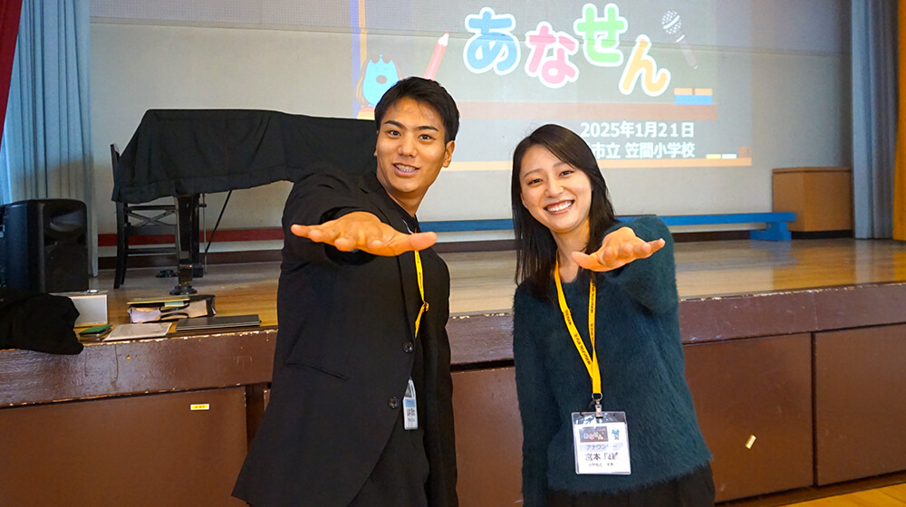 1月21日、横浜市立笠間小学校で出前授業『あなせん』を開催しました。今回の先生は、山本賢太アナウンサーと新人の宮本真綾アナウンサー。
