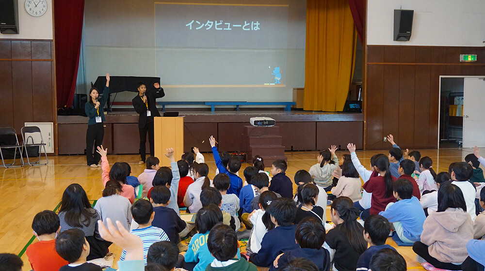 小学生3年生の2クラス85人の児童に、「インタビュー&スピーチ講座」を行いました。まずは、話すときの姿勢、そして5つの母音の発声などをみんなで練習。その後、上手にインタビューする3つのカギなどを学んだあと、2班に分かれて、山本アナ、宮本アナにインタビュー。笠間小の元気な児童たちから多くの質問が投げかけられ、ふたりも真剣に答えていました。