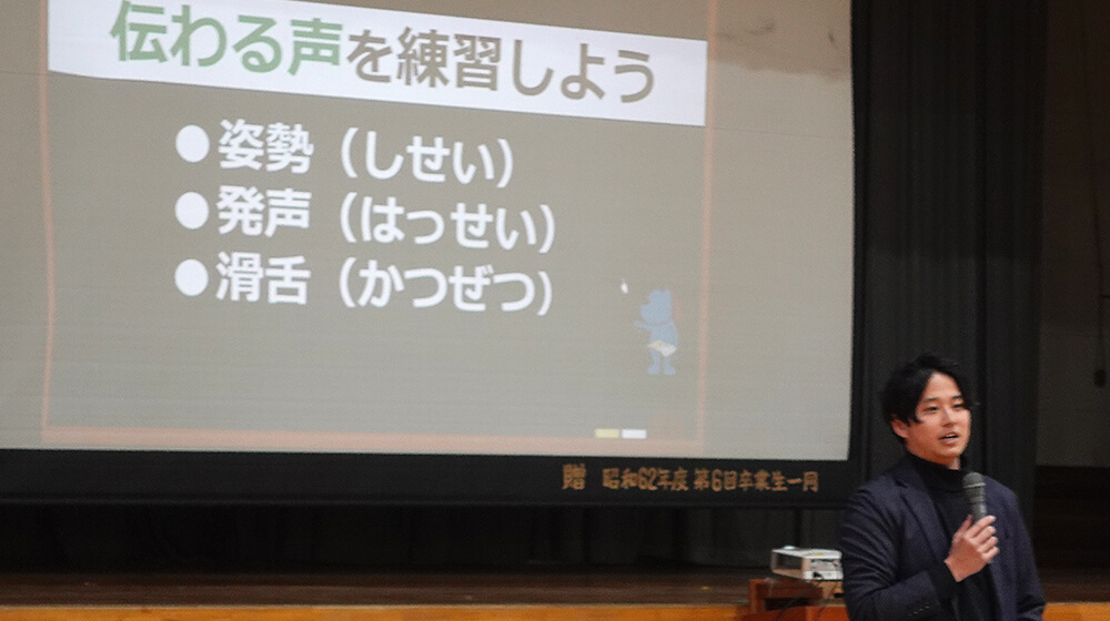 朗読の前に普段『あなせん』で行っている【姿勢・発声・滑舌】練習を生徒の皆さんに実践してもらいました。特に滑舌練習では、皆さん滑舌の難しさに驚きながら何度も練習をする姿がありました。また、大勢の生徒の皆さんの前で、代表して早口言葉にチャレンジをしてくださった生徒のおかげで授業もとても和やかに進めることができました。