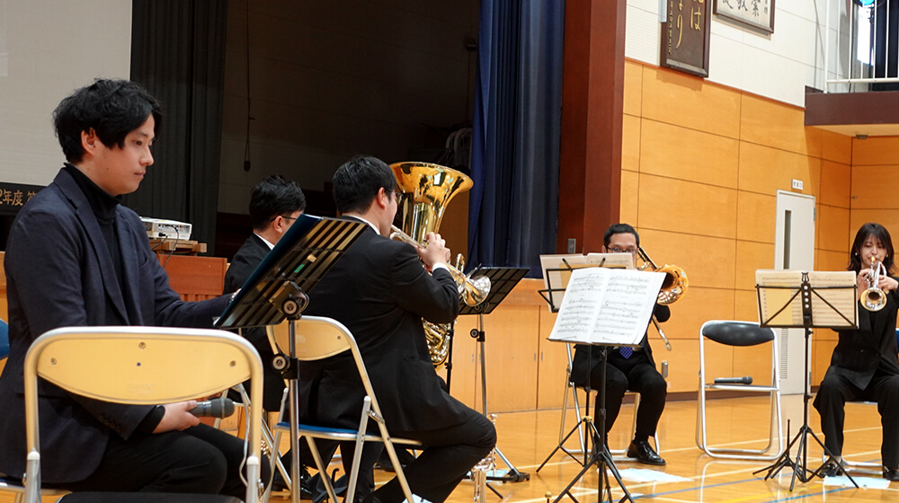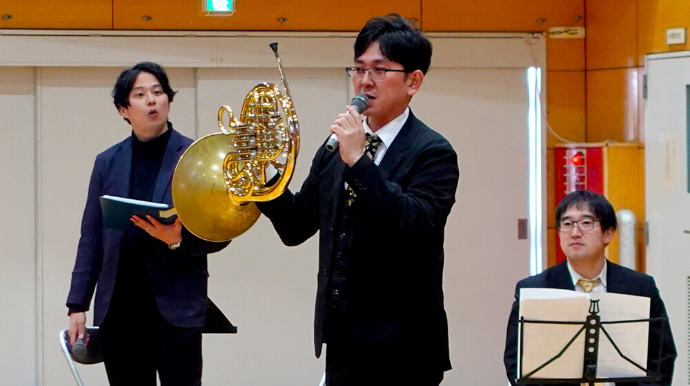 今回は、トランペット2人、ホルン、トロンボーン、テューバの金管五重奏の演奏に合わせて、黒瀬翔生アナウンサーが『WEST SIDE STORY』を朗読しました。