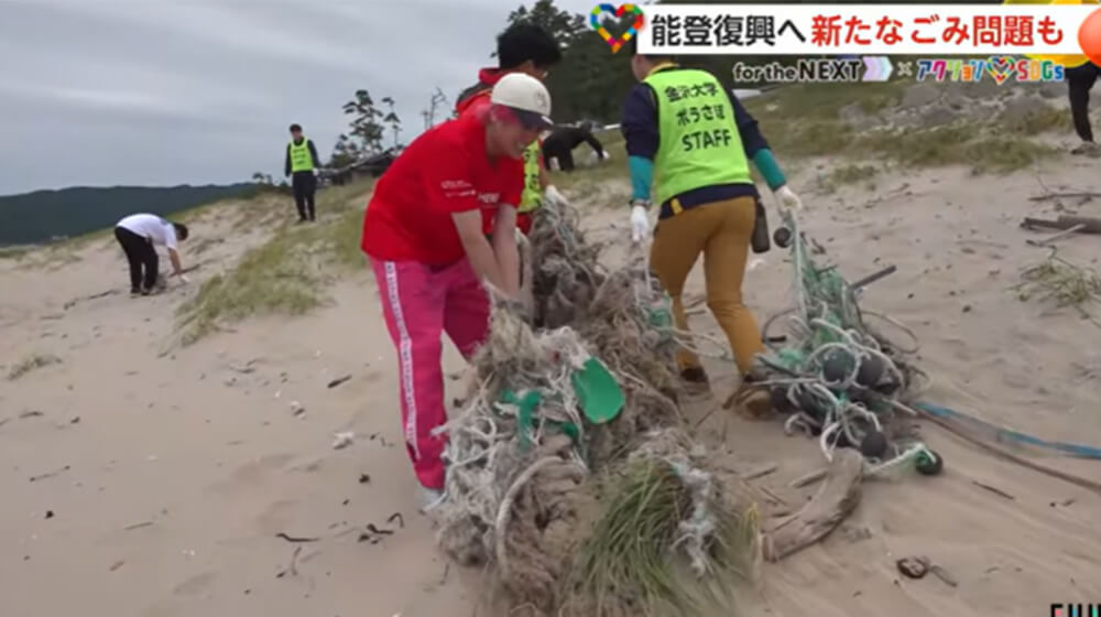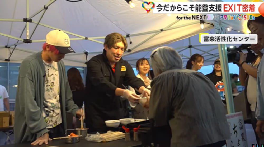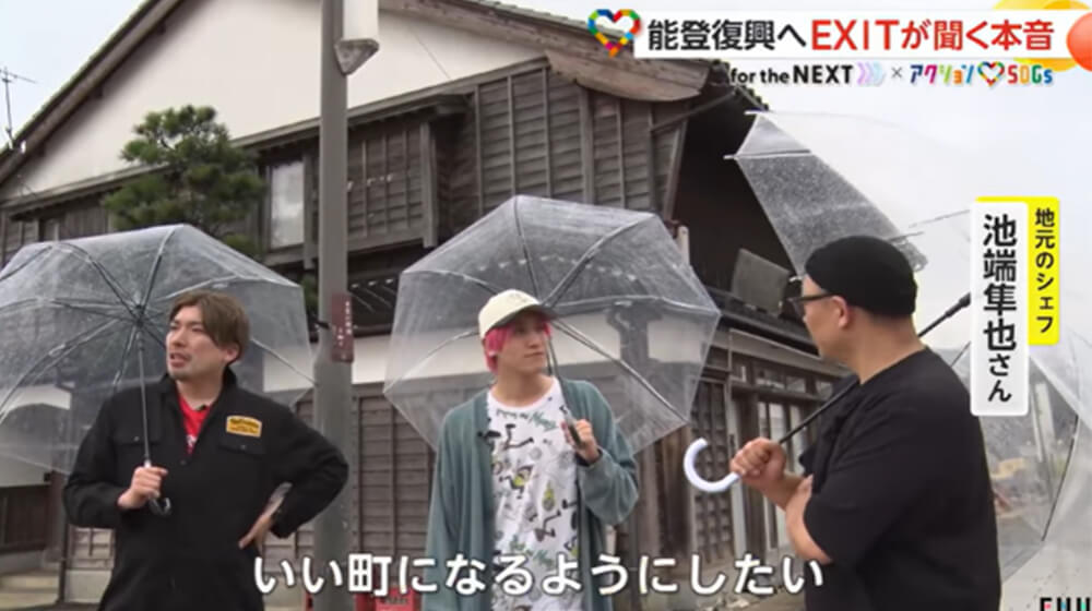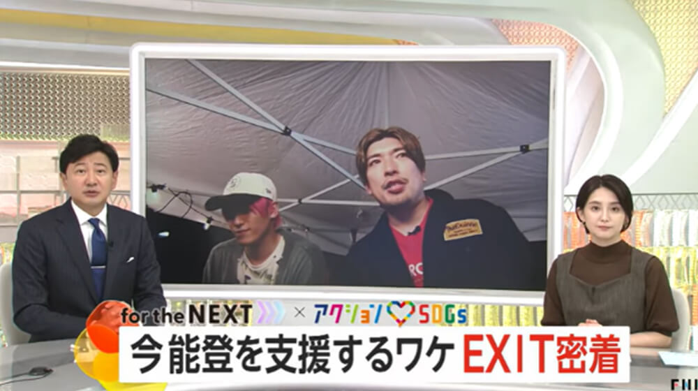 夕方の報道情報番組『FNN Live News イット!』では、フジ・メディア・ホールディングスで推進する「楽しくアクション!SDGs」のアンバサダーを4年連続で務めているお笑いコンビEXIT(りんたろー。と兼近大樹)の二人が、能登復興支援のためボランティアに参加する姿に密着取材しました。