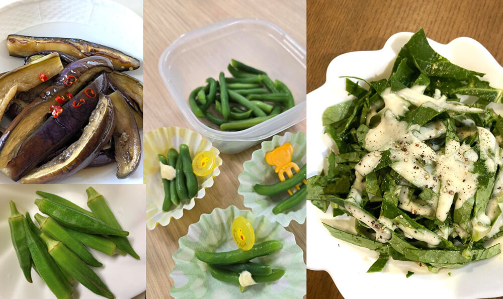 7月~秋にかけて枝豆、モロヘイヤ、ナス、ケール、いんげん、オクラを栽培しました。