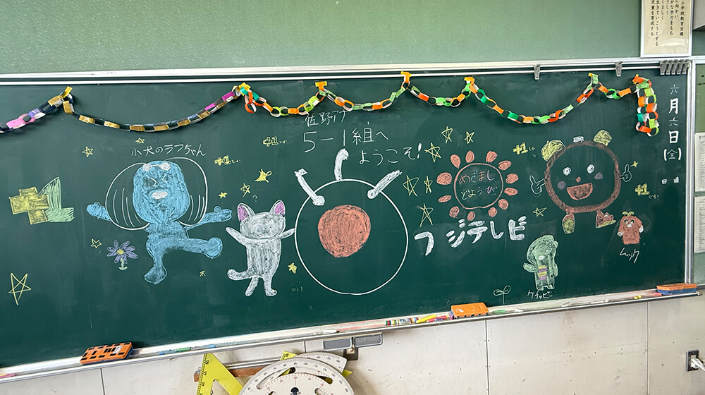 久しぶりの『あなせん』で大丈夫かしら?と心配でしたが、当麻田小学校のあちこちに歓迎の絵が飾られていて、「訪問を楽しみにしてくれていたんだ」と感じ、緊張が解けました。気心の知れた仲の佐野アナウンサーとの出前授業も楽しかったです。