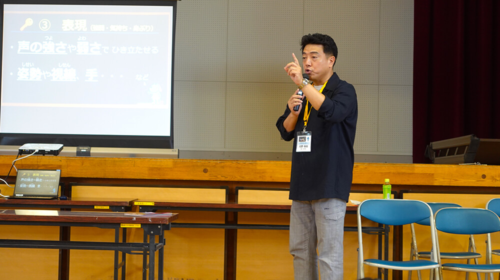 1時間目の授業は発声練習!みんな声がしっかり出ていてびっくりしました。「人に伝わる声」を日頃から意識をもって訓練しているからでしょう。素敵でした。また、学校の国語の授業では、「きいて、きいて、きいてみよう」というインタビューの授業があるそうで、話の意図を考えて聞きあい「きくこと」について考えているそうです。人の話を聞くとき、どれだけ相手の意図を理解して聞くかによって自分が得るものが大きく違ってきます。