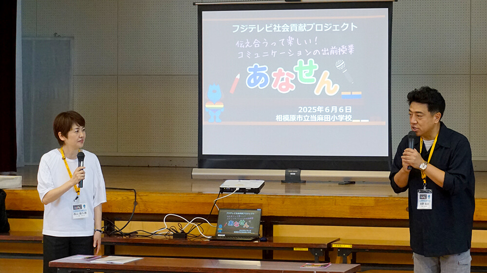6月6日、相模原市立当麻田小学校で出前授業『あなせん』を開催しました。今回の先生は、西山喜久恵アナウンサーと佐野瑞樹アナウンサー。