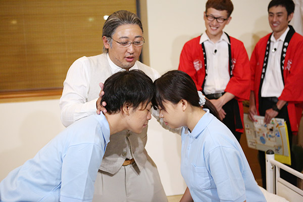 ホテル小涌園に宿泊するとめちゃイケ温泉のあるユネッサンの割引券がもらえるというお得な情報を伝えつつホテルの中へ。すると、そこにはロバート秋山演じる女将・大垣節子がホテルの社員に何やら説明をしている様子。山本は、いかにすごい人なのか興奮気味に説明。すると大垣節子がメンバーのそばへ・・・。