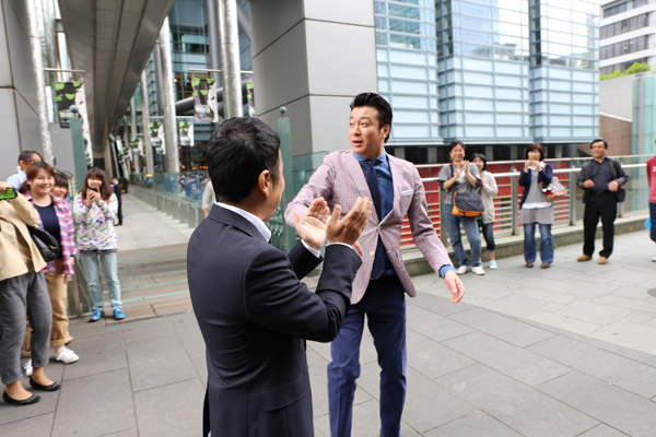 まずは最初のキャンペーン地・ダイバーシティ内特設会場へ移動。車中では懐かしい「極楽同盟」の話で盛り上がる。